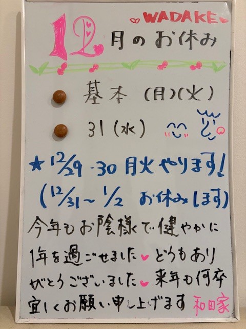 12月のお休みは、29・30を除く毎週(月)(火)、31日(水)です。
