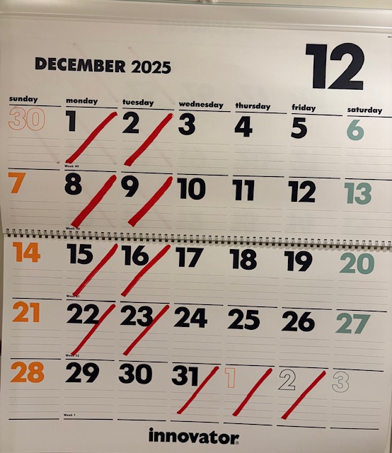 12月のお休みは、29・30を除く毎週(月)(火)、31日(水)です