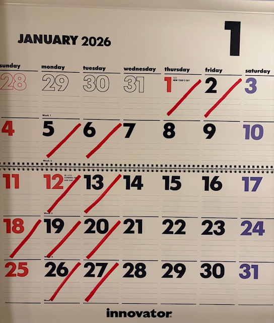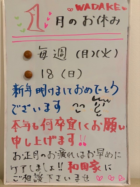 1月のお休みは、元日、2日、毎週(月)(火)、18日(日)です。